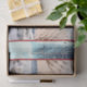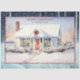 Your message is easily personalized (or delete if not needed). An adorable White Cape Cod home with green shutters is decorated for Christmas. It sits in a snowy landscape with a background of ocean water and border of a snowy forest winter scene. A beautiful collage is overlaid with a soft white ephemera layer that has handwritten calligraphy script and other vintage elements adding texture and elegance. Graphically designed by internationally licensed artist and designer, Audrey Jeanne Roberts, Copyright.
