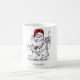 A white ceramic mug with a Christmas-themed illustration. The illustration features a whimsical depiction of Santa Claus, rendered in a sketch-like style with fine lines and shading. Santa is shown in a walking pose, wearing his traditional red hat with green holly leaves, a white beard, and a white suit with red accents. He is holding a red apple in one hand and a bag filled with a candy cane and a gift wrapped in red and white in the other. The words "Merry Christmas and Happy New Year!" are written in an elegant script at the bottom of the mug. The background is a plain white, which makes the illustration stand out. The style of the illustration is reminiscent of vintage Christmas cards, with a focus on detail and a playful, festive spirit.