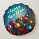 Merry Christmas & Happy New Year two sided Custom Personalize Text Round Pillow. Colorful decorations on a deep blue background. Personalize this pillow with your own text.