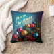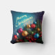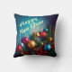 Merry Christmas & Happy New Year two sided Custom Personalize Text Throw Pillow. Colorful decorations on a deep blue background. Personalize this pillow with your own text.