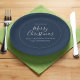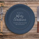 This design features a Merry Christmas holiday modern simple elegant paper plate, traditional winter minimalist navy blue, chic minimal calligraphy script font, modern hand-lettering script font, classic family name contemporary, whimsical typography template, with elegant flourish vintage pattern, with Merry Christmas, a holiday Christmas party dinner dessert paper plate