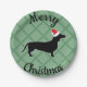 Merry Christmas dachshund dog wearing a santa hat paper plate with a green diamonds patterned background.