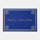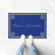 Doormat shown with a deep blue background, silver-colored and gold-colored borders surrounding the doormat and phrase of "Merry Christmas" in a upbeat text in gold-colored near bottom of doormat and four snowflakes in gold-colored .