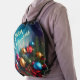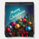 Merry Christmas Drawstring Backpack with custom personalize Text. Colorful decorations on a deep blue background. Personalize this bag with your own text.