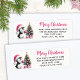 These stylish pink Christmas return address labels feature the "Merry Christmas" saying in pink casual script font and a cute penguin in a pink Santa hat decorating the Christmas tree. The template makes it easy to type your address before ordering. This design is on a white background.