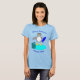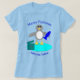 This t shirt features a cute little gray and white penguin with beady black eyes and yellow beak and feet. The penguin is holding a big blue fish with one flipper and standing on a pale blue lump of ice. There is an open present next to the penguin complete with a festive ribbon.