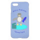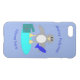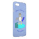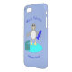 This awesome phone case features a cute little gray and white penguin with beady black eyes and yellow beak and feet. The penguin is holding a big blue fish with one flipper and standing on a pale blue lump of ice. There is an open present next to the penguin complete with a festive ribbon.
