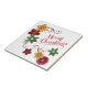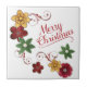 This festive Holiday tile features a pretty trio of gold, red, and green Christmas flower images at the top left, and more at the bottom right. The flowers are embellished with red swirl designs. The decorative text at the side says "Merry Christmas" in red. Everything is placed on a snow white background. Pretty for the Christmas Season!