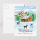A "Merry Christmas from our home to yours" holiday postcard decorated with a little red cabin in the woods tucked up against a mountain range and everything is frosted with snow with deer in the front yard curious about the snowman illustrated with watercolor. You can edit the text to fit your needs.
