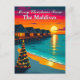 A festive postcard featuring a tropical Maldives Christmas with overwater villas, a decorated Christmas tree, and a warm golden sunset. Perfect for sending holiday greetings from paradise.