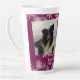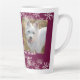 Tall burgundy wine colored latte mug with two photo templates and custom text. A snowflake design at top and bottom makes this a perfect Christmas gift or winter birthday gift. Personalize the text with a name and customize in two lines beneath angled photos of cats, dogs, or any pet. Or make it with pictures of people - whatever you like. The pretty wine purple color makes the furbaby photos stand out. Text is white.
