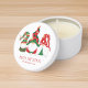 Cute personalized holiday mini candle stocking stuffer gifts or holiday party favors featuring three Scandinavian-style gnomes with a seasonal red and green hats, "Merry Christmas" and your name in red lettering.