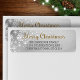 Pretty silvery frosted, swirly background with a sprinkling of snowflakes in the corner and gold Merry Christmas lettering, on these custom, personalized address labels.