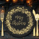 Holiday party paper plates feature twinkling gold stars, circles and dots surrounding the words "Merry Christmas" on a black background. MATCHING items in our collection.