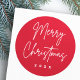 Merry Christmas stickers with the text "Merry Christmas" in a handwritten style script font on a red background with the year or custom text below.
