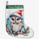 Christmas Stocking featuring a cute watercolor Owl with a Christmas hat. Customizable.