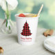 This design features a merry Christmas calligraphy script cute paper cup with a simple Christmas tree buffalo check, a stylish trendy calligraphy script text, a rustic country farmhouse minimal, minimalist festive holiday pattern, red black and white design, coffee tea cocoa hot drinks supplies, a creative simplistic checkered style, Christmas holiday fun celebration, a custom disposable party paper products
