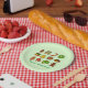 Plates feature an original holiday illustration of delicious holiday cookies on a green background. Perfect for Christmas celebrations!
