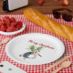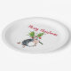 Cute holiday season paper plates feature whimsical watercolor illustration of marching hedgehog with branch of holly and customizable "Merry Christmas" text