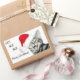 Silver tabby kitten in a Santa Hat with his mouth open giving a cheerful Ho ho ho, Merry Christmas greeting rectangular sticker. Text can be easily changed or removed, kitten can be repositioned.