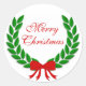 Merry Christmas Laurel Leaf Wreath and Red Bow Classic Round Sticker