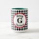 A classic black and white houndstooth print, with red framed Merry Christmas and single initial and, option to edit and add name. This is a large 15oz. combo color beverage mug, also available in 11oz. size. Choose from 5 colors for handle and inside. Easily change all text using the Template provided. Makes a perfect holiday gift for family or friend. See "About This Product" at side for more information.