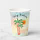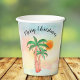 These island style paper cups feature hand drawn palm trees decorated with lights and a sun on a watercolor background.