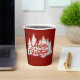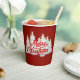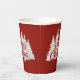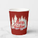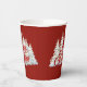 Merry Christmas paper cups backed with white trees trimmed in red background. Paper plates to match.