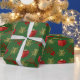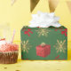 Festive personalized Christmas holiday wrapping paper design with gold winter snowflakes and red glitter Xmas present and red ribbon bow on a plain green customizable background, personalize this design by adding your family name or Xmas text greeting and adding your favorite family photo. PLEASE NOTE the gold is not metallic.