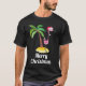 Dark colored mens long sleeved shirt with white lettering which says Merry Christmas. Designed with a whimsical drawing of a pink flamingo wearing a red santa hat. Standing on a mound of yellow beach sand with a green and brown coconut palm tree in the back. Cute and fun festive tropical design.