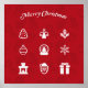 A trendy, modern and festive themed illustration. The graphic features a set of 9 christmas icons. The background is red with a faint pattern of various popular christmas symbols. On top of the red background in bold bright white are some more seasonal christmas icons including a snowflake, angel, wrapped gift, santa face, sprig of pine, a snow globe, a warm fireplace, a decorated christmas tree and an ornament. Merry Christmas is written at the top in a cheerful white font. Cute, trendy and fun.