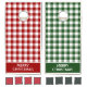 Christmas cornhole set features one board with a classic red and white buffalo check pattern and a second board with a green and white buffalo plaid, each with a modern font "MERRY CHRISTMAS" in a matching red or green rectangle at the bottom. You can customize the text in the sidebar if you like. Host a fun game at your holiday party.
