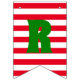 Custom, personalized, red Santa Calus, snowflakes and stripes, fun, colorful, festive red and green "Merry Christmas", sturdy plastic polystyrene bunting banner with thick plastic rope. Great for holiday decor of christmas parties and celebrations.
