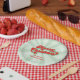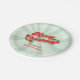 This design features a merry Christmas red-green typography paper plate with a cute whimsical fun festive design, light green retro groovy swirl, simple minimalist minimal style, custom customize customizable template, holiday celebration celebrate fun, stylish trendy modern calligraphy font, gift party dinner dessert appetizer, holiday disposable party supplies, customized party paper supplies