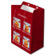 Modern Christmas gift bag for kids, with Rudolph the Reindeer, the greeting "Merry Christmas," and a personalized name. On a Xmas red background.