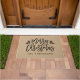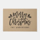 This festive holiday doormat features "Merry Christmas" in playful stacked black brush lettering with holly berry accents and your family name below on a warm rustic tan textured background. The compact, bold layout makes a cheerful seasonal statement at any front door. Family name is fully customizable.