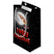 Red Merry Christmas text with snow, moon, Santa Claus in sleigh, and reindeer in snowflakes on black.