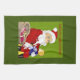 Merry Christmas Santa & Child kitchen towel with a little girl on Santa Claus' lap, giving her request for presents, and a bag of presents in a sack next to Santa. Art by Kristie Hubler