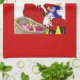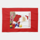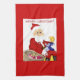 Merry Christmas Santa & Child kitchen towel by Kristie Hubler, with a little girl sitting on Santa's lap, and a bag of presents next to them.