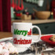 Mug with Merry Christmas in 3D text and Santa's sleigh . Mug available in several styles and colors. Makes a great Christmas present for sipping hot beverages on cold nights during the holidays.