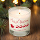 Festive scented candle for the holiday season featuring a red silhouette of reindeers flying Santa's sleigh through the air, "Merry Christmas" in a modern red script and your name in simple red typography.