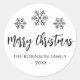Modern Script Black and White "Merry Christmas" Calligraphy Script Christmas Holiday Round Sticker. Features cute snowflakes (snowy) background, family name and year. Great for Mailing Accessories Envelope Seals and Gift Stickers.