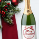 Chic, modern cursive script across a gorgeous red ribbon and bow reads MERRY CHRISTMAS in elegant cursive typography. A tied bow is super trendy for 2025 holiday party champagne bottle labels. Personalize with your family or business name in the center.