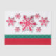 The design features red stylized snowflakes and green plaid ribbon on a red background