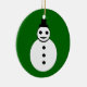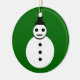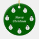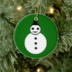 This fun festive Christmas tree decoration features a smiling white Christmas snowman with black buttons and a top hat. He looks like one cool gent and would love to help you spread the joy of Christmas this year. The background is a festive shade of green. The snowman appears once on the front of the ornament and circles the words "merry Christmas" on the back of the ornament. The text is customizable to allow you to personalize this gift if you wish to do so.
