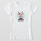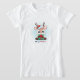 A white t-shirt with a cartoon reindeer holding a gift. The reindeer is wearing a red and white Santa hat and has large, expressive eyes. The gift is wrapped in green paper and tied with a red ribbon. The words "Merry Christmas" are written in blue cursive below the reindeer. The background is a light blue color. The style is reminiscent of watercolor illustrations, with soft, diffused lighting and a focus on cute, whimsical details.