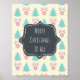 A poster with a cute christmas pattern with a cream colored background with illustrations of a pastel greenish blue colored christmas tree and a pastel pink bauble with a ribbon in a repeating pattern. A fancy chalkboard style square in the center says: Merry Christmas To All. Words can be changed to suit your needs.