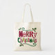 A tote bag with the words "Merry Christmas" printed on it. The word "Merry" is in red and the word "Christmas" is in green. There are holly leaves and berries around the words. The bag is made of a light-colored canvas material.