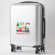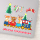 This whimsical sticker features three adorable animals, a cat, bear and reindeer, riding in a Christmas train. The train is decorated with Christmas stockings and a tree.