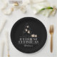 The words Merriest Christmas in retro vintage lettering, a white sketch tree with faux gold foil ornaments and gifts are featured on these black paper plates - available in 2 sizes - personalized with your family name. Stylish for any Christmas holiday occasion or give as a hostess gift. MATCHING items in our store.